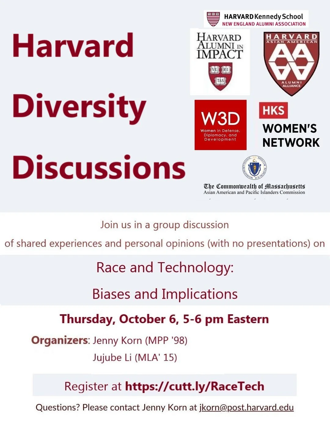 Harvard Diversity Discussions hosted by the Harvard Asian American Alumni Alliance (H4A), Harvard Alumni in IMPACT, Harvard Kennedy School Women's Network (HKSWN), Harvard Kennedy School New England Alumni Association (HKSNEAA), Massachusetts Asian American and Pacific Islanders Commission (AAPIC), and Harvard Women in Defense, Diplomacy, and Development (W3D) Join us in a group discussion of shared experiences and personal opinions (with no presentations or breakouts) on Race and Technology: Biases and Implications Organized by Jenny Korn (MPP '98) and Jujube Li (MLA' 15). If you have questions, feedback, or suggestions for topics for future Harvard Diversity Discussions, please contact jkorn@post.harvard.edu.
