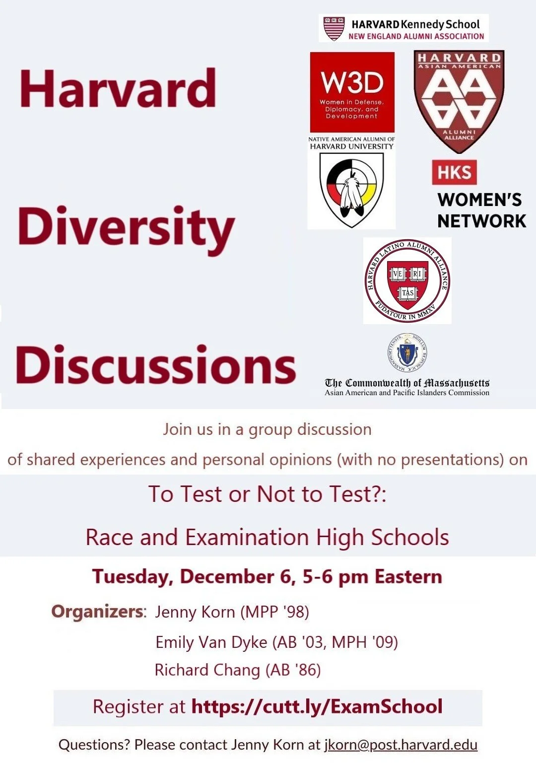Harvard Diversity Discussions hosted by the Harvard Asian American Alumni Alliance (H4A), Native American Alumni of Harvard University (NAAHU), Harvard Latino Alumni Alliance (HLAA), Harvard Kennedy School New England Alumni Association (HKSNEAA), Massachusetts Asian American and Pacific Islanders Commission (AAPIC), and Harvard Women in Defense, Diplomacy, and Development (W3D). Join us in a group discussion of shared experiences and personal opinions (with no presentations or breakouts) on To Test or Not to Test? : Race and Examination High Schools Organized by Jenny Korn (MPP '98), Emily Van Dyke (AB '03, MPH '09), and Richard Chang (AB '86). If you have questions, feedback, or suggestions for topics for future Harvard Diversity Discussions, please contact jkorn@post.harvard.edu.