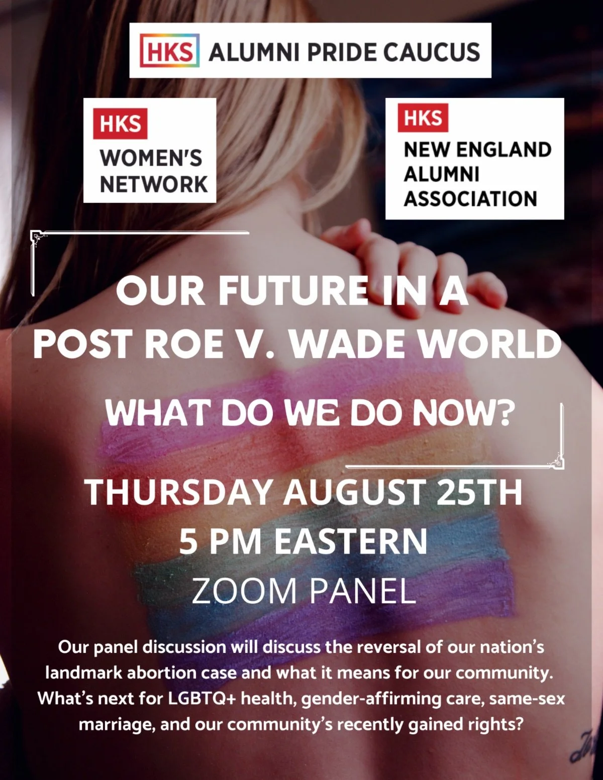 The HKS Alumni Pride Caucus in partnership with the HKS Women's Network and HKS New England Alumni Association will host a virtual panel about our post-Roe v. Wade world.
