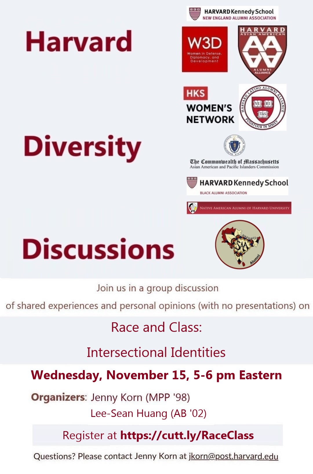 Organized by Jenny Korn (MPP '98) and Lee-Sean Huang (AB '02). If you have questions, feedback, or suggestions for topics for future Harvard Diversity Discussions, please contact jkorn@post.harvard.edu.