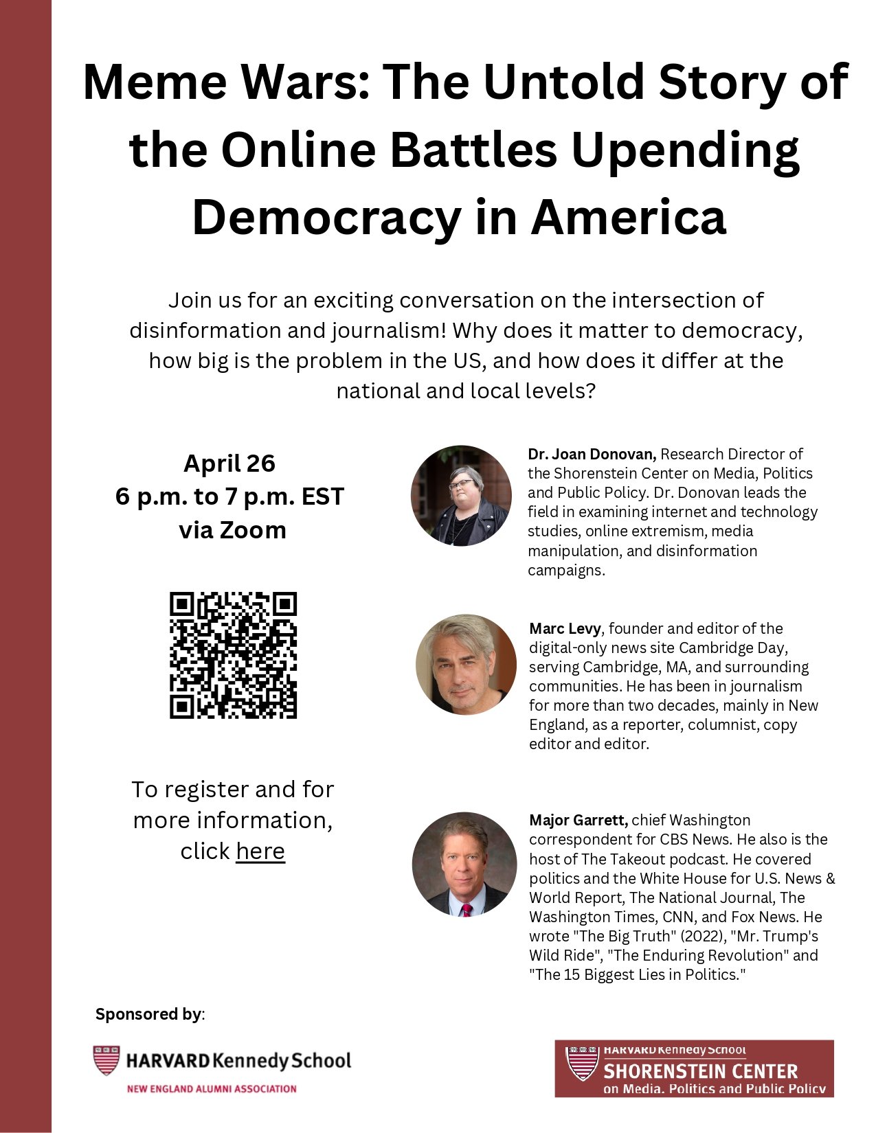 Dr. Joan Donovan is the Research Director of the Shorenstein Center on Media, Politics and Public Policy. Dr. Donovan leads the field in examining internet and technology studies, online extremism, media manipulation, and disinformation campaigns. Dr. Donovan leads The Technology and Social Change Project (TaSC). TaSC explores how media manipulation is a means to control public conversation, derail democracy, and disrupt society. TaSC conducts research, develops methods, and facilitates workshops for journalists, policy makers, technologists, and civil society organizations on how to detect, document, and debunk media manipulation campaigns. Dr. Donovan and the TaSC team produce Media Manipulation Case Book, Meme War Weekly (MWW) newsletter, and BIG, If True webinar series. Dr. Donovan will discuss the work she leads at HKS, disinformation-related concerns she have moving ahead, and her new book, Meme Wars.
